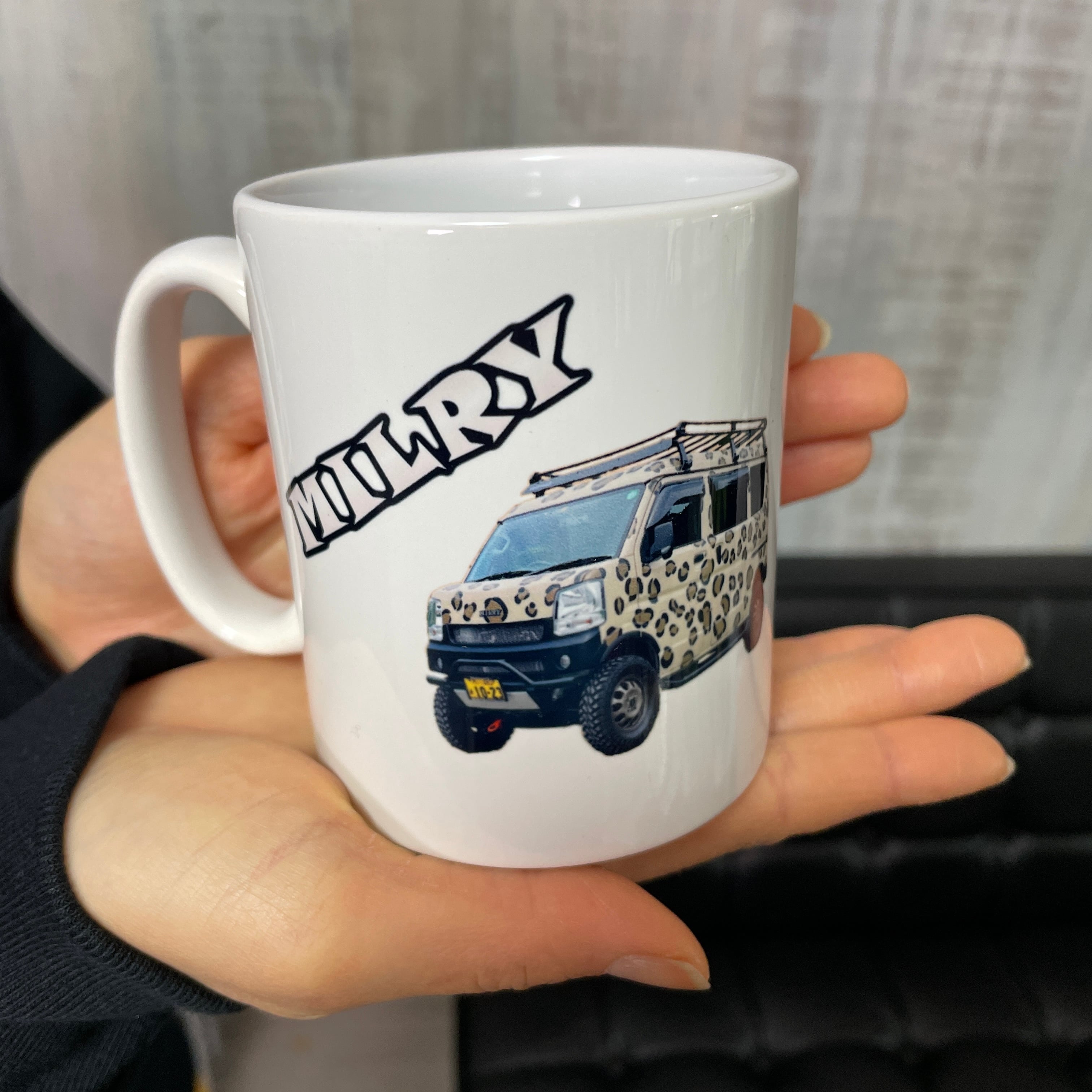 みるみるランドの愛車エブリイ「みるりー」と、みるみるランドのマスコットキャラクター「みるみるくん」をデザインしたマグカップです。