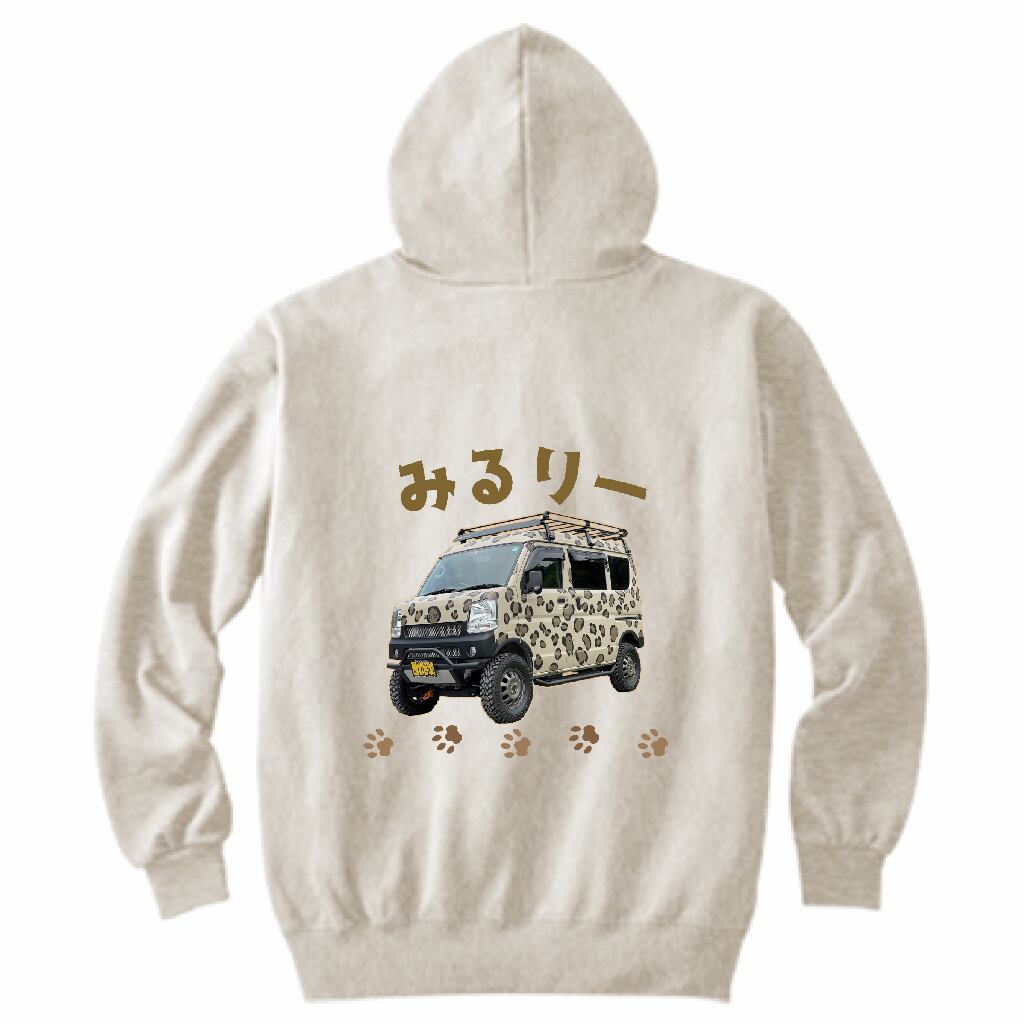 背中に「みるりー」の文字と画像、5つの足跡をデザインしたジップアップライトパーカーです。