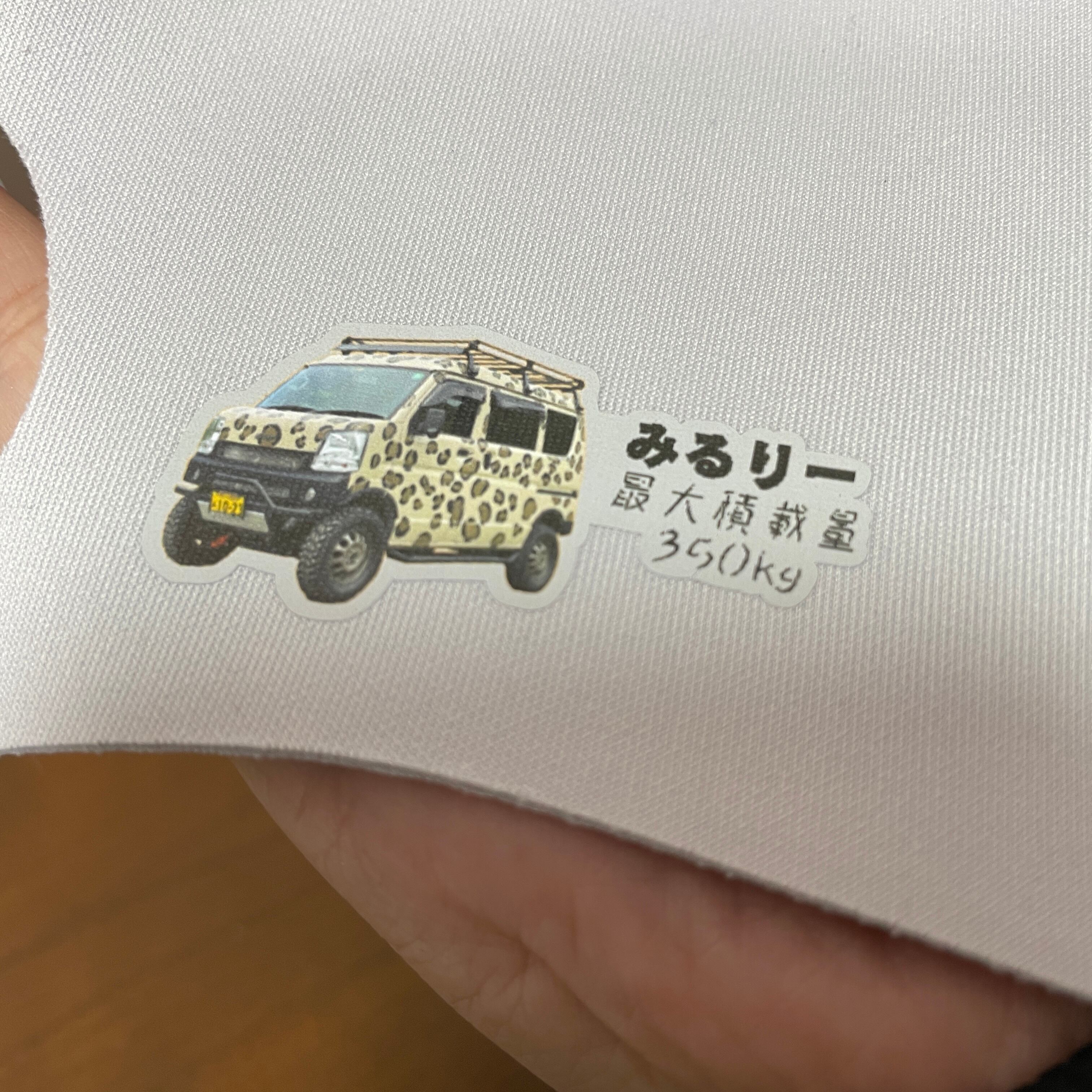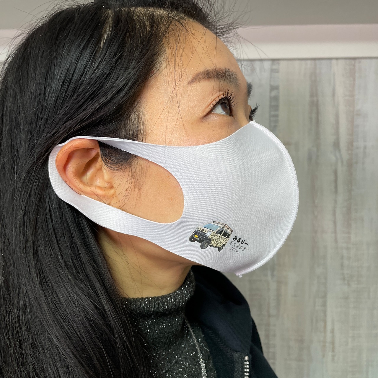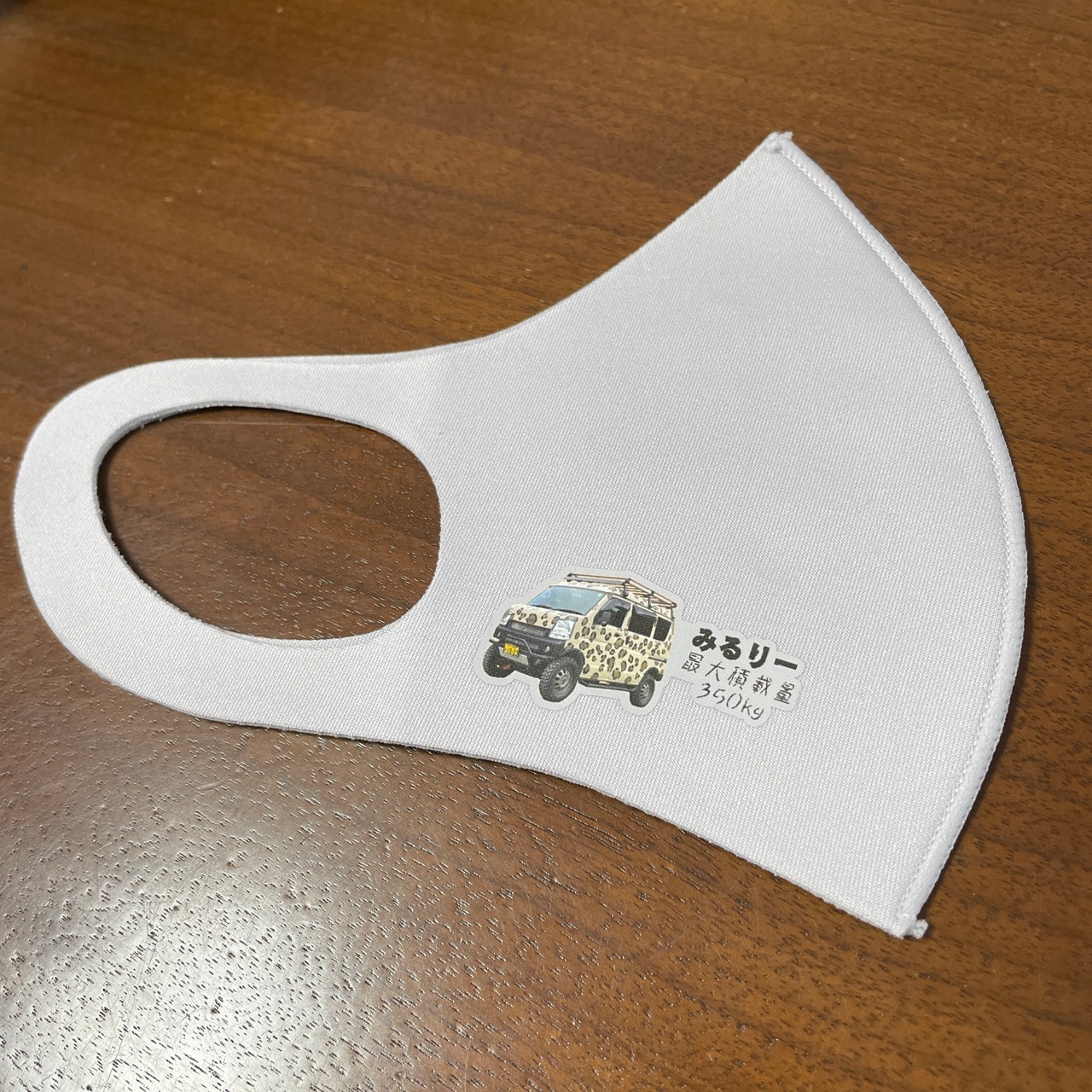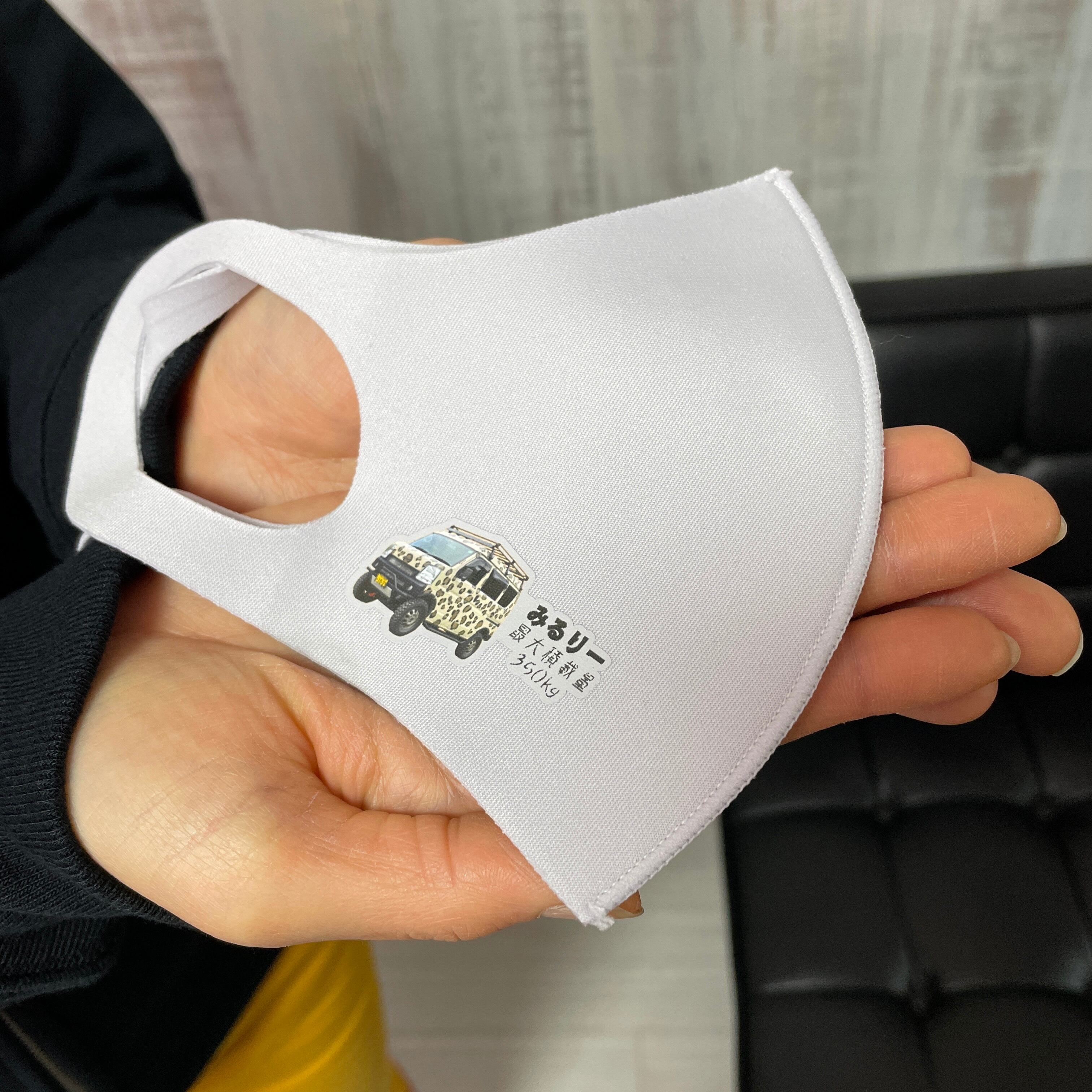 みるみるランドの愛車エブリイ「みるりー」の画像と文字、「最大積載量350kg」の文字がデザインされたマスクです。