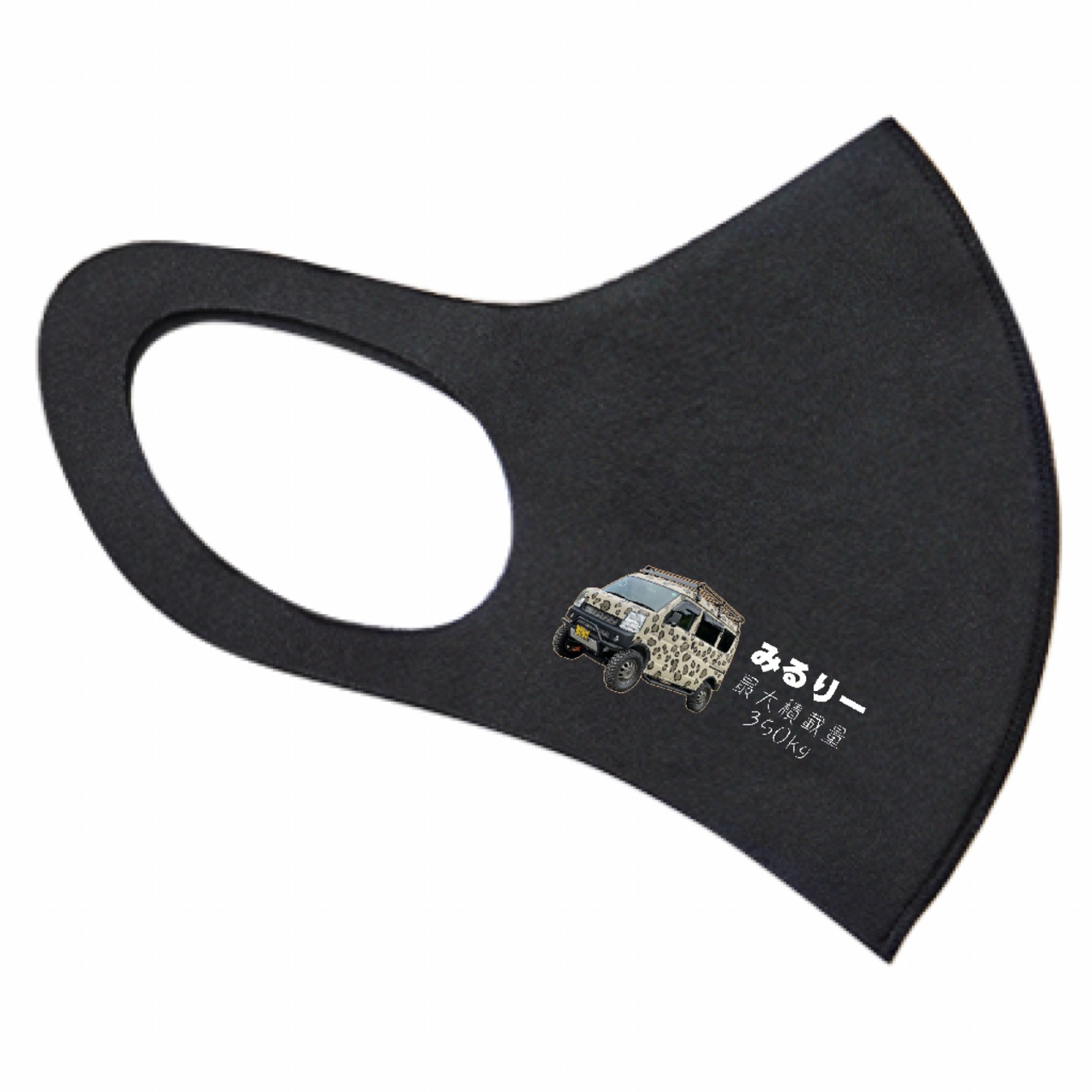 みるみるランドの愛車エブリイ「みるりー」の画像と文字、「最大積載量350kg」の文字がデザインされたマスクです。